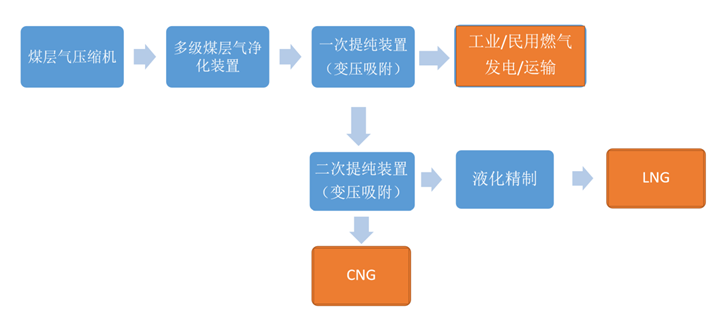 煤層氣/沼氣回收提純甲烷裝置是依據氣體在高壓下吸附低壓下解吸的原理對混合氣進行分離提純,含甲烷尾氣經凈化加壓后進入PSA系統分離得到不同濃度甲烷產品氣,依據原料氣中甲烷含量的差異以及產品氣設計工藝路線。