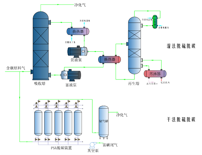 天然氣、合成氣、煉廠氣、煤氣以及窯爐煙氣等中含有硫化氫(H2S)、二氧化硫(SO2)、二氧化碳(CO2)等酸性氣體,需要脫除,方可使用。公司采用軟件模擬和工程實(shí)踐相結(jié)合,對濕法脫硫工藝、塔器結(jié)構(gòu)、再生溫度等工藝做了大量的優(yōu)化改進(jìn),取得了良好的效果。干法脫硫脫碳工藝采用實(shí)驗(yàn)室測試和工程實(shí)踐結(jié)合,使用軟件模擬氣流分布,優(yōu)化氣流分布,減小死空間,大大提高了脫除效率,延長了吸附劑壽命,可以滿足不同用戶工況條件下的脫硫脫碳要求。